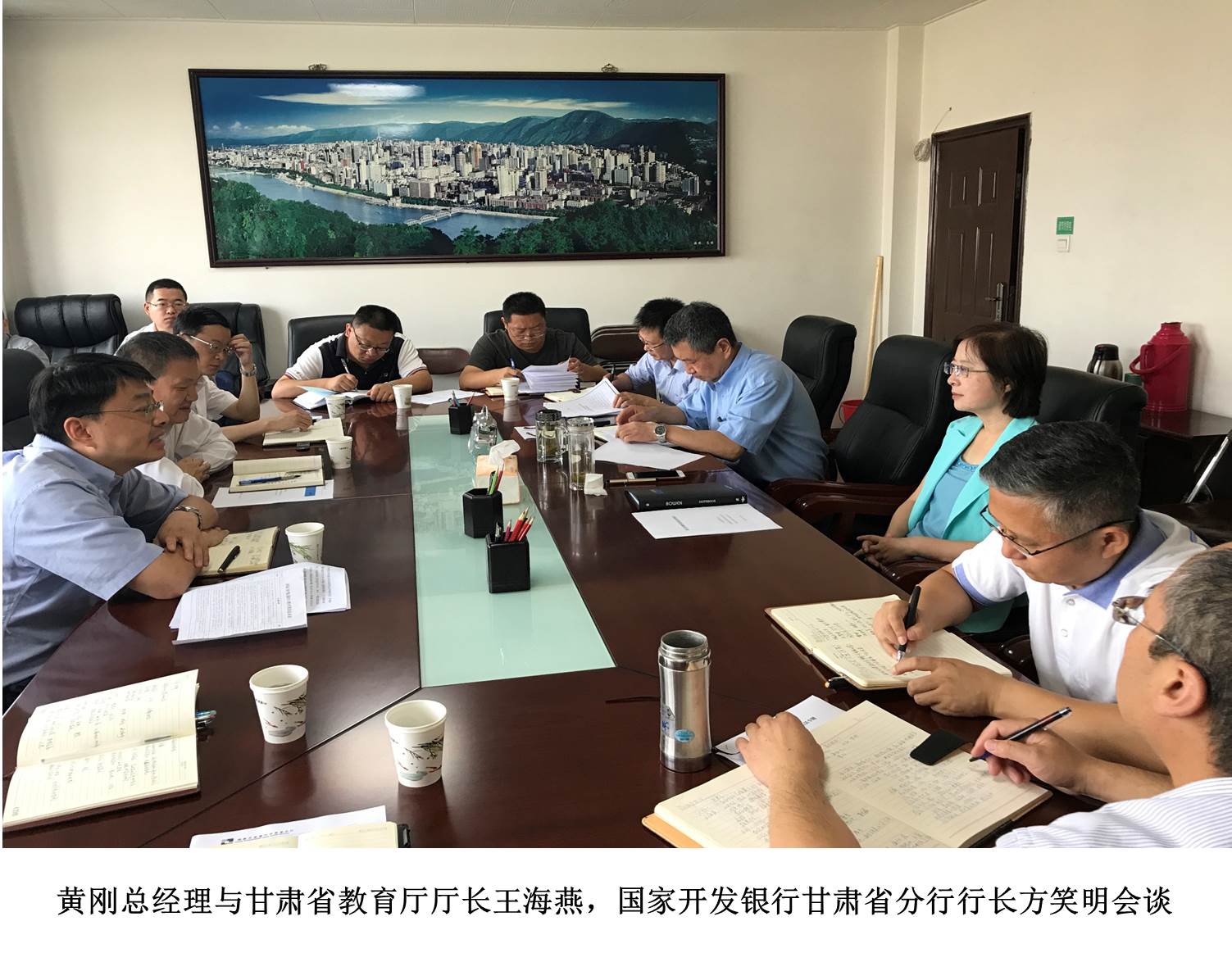 8月8日-10日,为落实在全国打赢教育脱贫攻坚现场会签署的助力甘肃教育脱贫协议,黄刚总经理一行3人赴甘肃临洮县、武威市实地考察教育扶贫PPP项目,并与当地主要领导座谈。