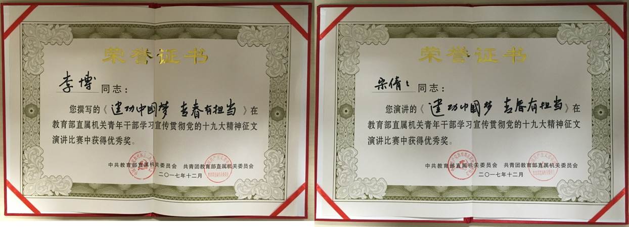 2017年12月13日,教育部举办直属机关青年干部学习宣传贯彻党的十九大精神征文演讲比赛,我华会体育团支部选送由李博撰写、宋倩倩演讲的《建功中国梦 青春有担当》参加比赛,荣获优秀奖。
